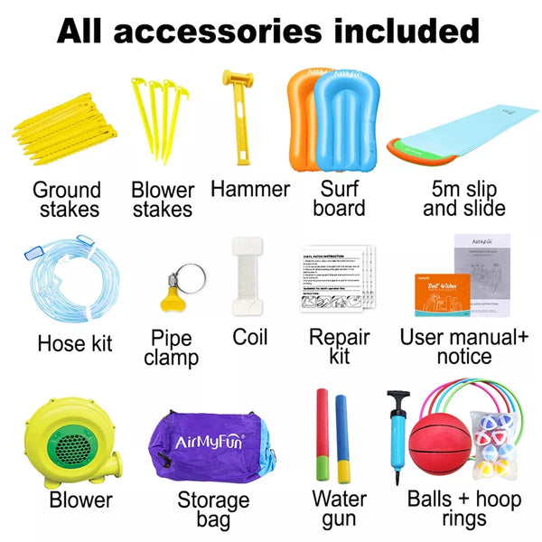 Setting up the water park is easy with full inflation in just 2 minutes. The included accessories have all you need to get it up and equipped with all the necessary play gear, and anchored down for a steady and sturdy inflatable at all times.