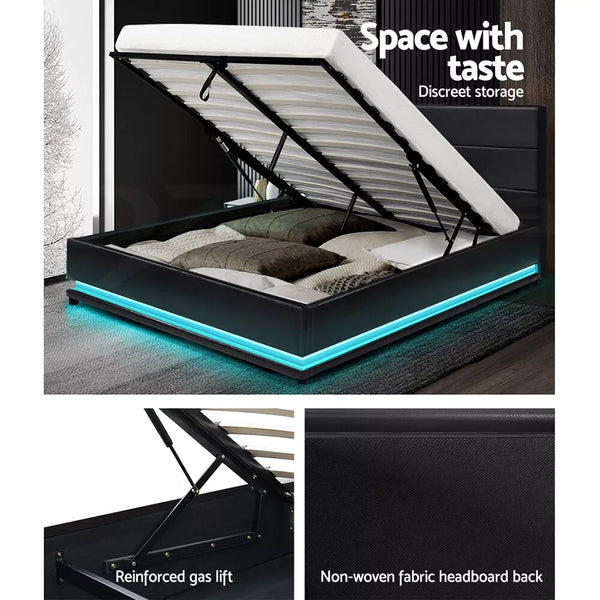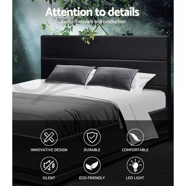 When is a bed more than a bed? When it uses our Artiss LUMI Gas Lift Bed Frame. On the outside, this bed frame looks like just any other quality bed frame. Beautifully padded with generous foam and covered in PVC leather. Strong steel frame with high grade steel centre rails, heavy-duty bars and arched slat base. Large and comfortable headboard. But with one easy gas lift of the bed base, the bed frame becomes an instant storage area with acres of space for your bedding essentials. Simply store your extra pillows, bed sheets, cushions and more in the storage compartment and hide them away for the season. Even better, you no longer have to fumble in the dark for a light switch in the middle of the night with this bed frame. It comes with built-in LED lighting that can be customised into 16 different colours and 4 flashing modes to suit your preference. Not only will the illuminated bed frame create a beautiful ambience, it will also save you from buying extra bedside lamps or nightlights. So do not just get any bed frame, get this 3-in-1 bed frame to expand your home storage capacity and light up your nights with just a lift of your hands.