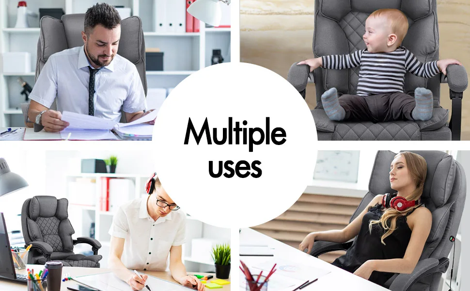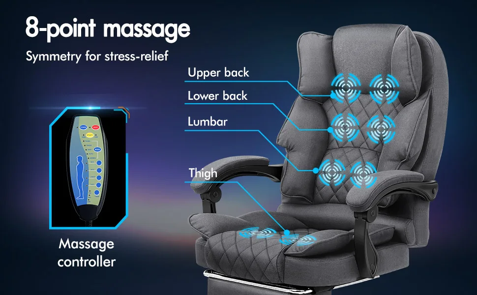 Crafted with innovation in mind, we upgraded the chair with 8 massage points and gentle seat heat function, allows you to work at your peak for long periods of time in optimal comfort. Built with premium linen fabric, generous foam paddings and ergonomically-friendly design, our chair provides your entire body with ample support in all the right places. The chair perfectly combines both comfort and style.
