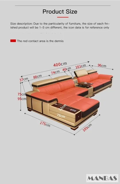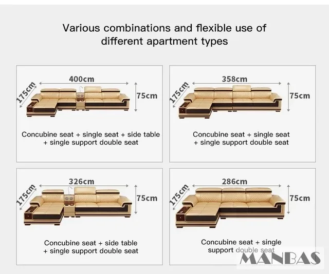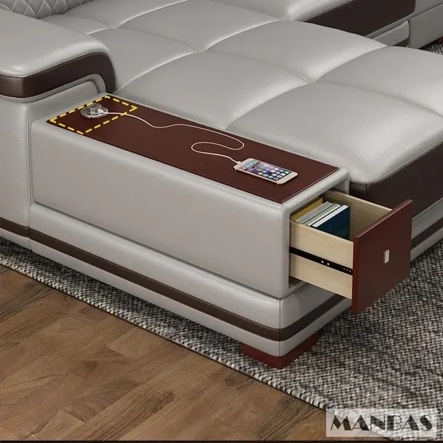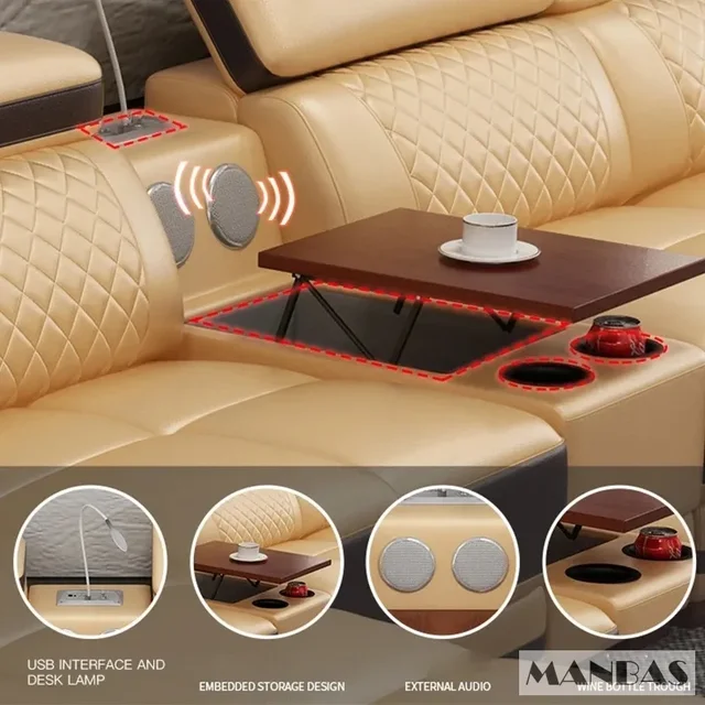 MANBAS Italian Genuine Leather Sectional Sofa Set with Cup Holder, Adjustable Headrests & Bluetooth Speaker Living Room Couch