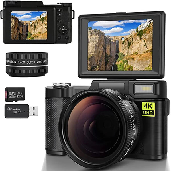 【16X Digital Zoom and 3.0" 180° Flip Screen】: This camera is equipped with a 16X digital zoom, allowing you to capture distant objects with ease. It also features a 3.0-inch IPS LCD screen that can flip up 180 degrees, making it perfect for taking selfies. You can view your photos and videos from any angle with this screen. The camera also comes with a 32GB SD card, so you can start using it right away.