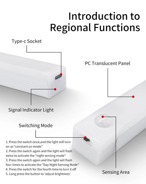 1: Human body induction sensor: This human body induction wardrobe light has high sensitivity and high precision, this LED wardrobe light can detect your motion within 5 meters, and automatically turn off within 25 seconds. No more pressing the switch button in the dark.