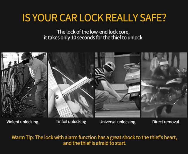 Press the lock core,it will be locked and you will hear the sound "DU", which means it is coming into alarm status,after 5 seconds,When the lock or vehicle is vibrated,the lock will give an alarm"DU DU DU" three sounds,when the lock is vibrated again,after 5 seconds,it will give an alarm and keep alarm with serial vibration.Eeach alarm will last for 10 seconds.