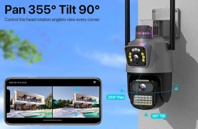 - The PTZ security camera has a panning function and can rotate 355° horizontally at high speed. The 90° tilt rotation can achieve reliable home and business monitoring without vertical limitation and "dead zones".