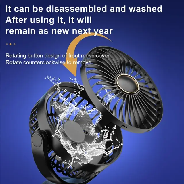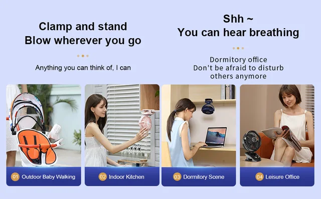 1. This personal fan is equipped with an easy-to-open clip thatwill easily clamp onto any surface, and the soft rubber will provide greatprotection for the surface of your object. Even when running upside down, itcan still be adjusted to all directions. And it can stand firmly on a tabletopor be hung to meet your various use needs.