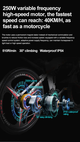 Motor: 250W brushless waterproof motor (peak power 500W), compliant with EU road standards